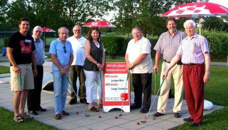 „Gemeinsam sind wir stark“ – Politik beim Minigolf: Vertreter der SPD-Ortsvereine Neufahrn, Mallersdorf-Pfaffenberg, Geiselhöring und Pfeffenhausen mit SPD-Bürgermeister Bernd Zauner (2.v.l.) und den Sprechern des AK Labertal Ruth Müller und Rainer Pasta (Mitte)